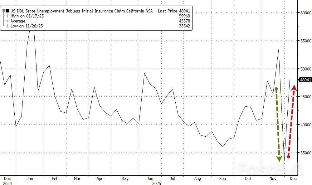 未经季节性调整的数据更能说明问题。上周,未经调整的初请人数激增了近11.5万人,同样是2020年3月以来的最大增幅。其中,加利福尼亚州、伊利诺伊州、纽约州和德克萨斯州等人口大州是增长的主要来源。