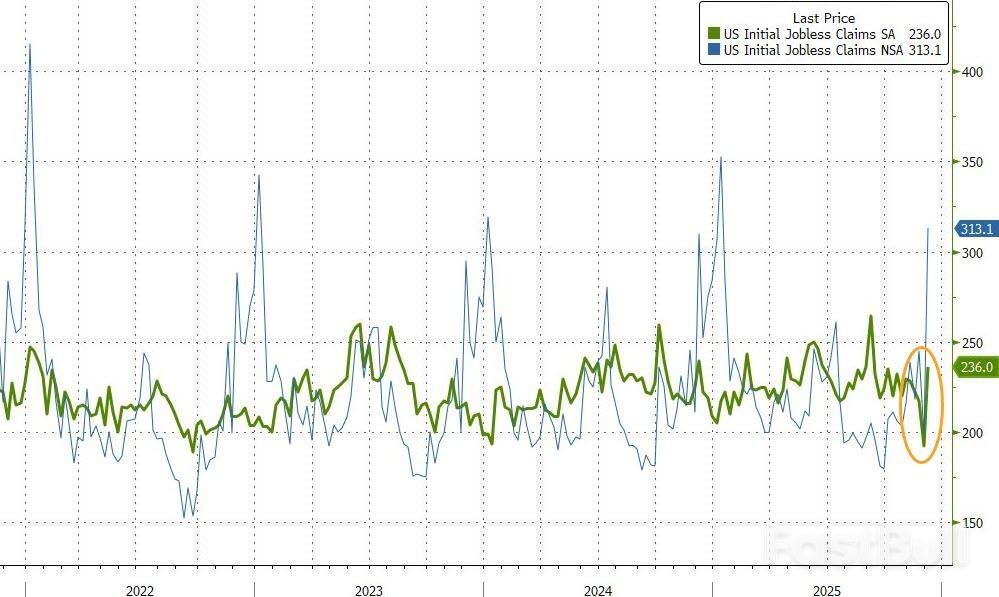 美国劳动力市场最新公布的数据,让市场大感意外。上周,首次申请失业救济的人数激增4.4万人,达到23.6万人,创下自2020年3月疫情爆发以来的最大单周增幅。这一数字与前一周触及的近60年低点(19.2万人)形成了巨大反差。
