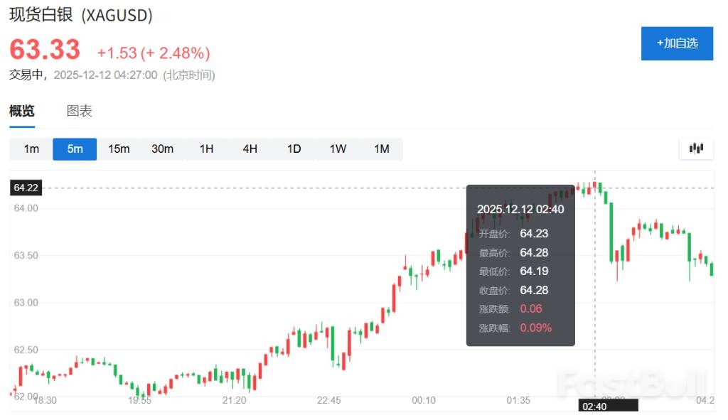 白银的强劲涨势仍在继续,再次成为市场焦点。12月11日,兼具工业金属与避险资产双重属性的白银价格再创新高,现货白银一度触及64.28美元/盎司的历史高位。纽约期银也表现抢眼,日内涨幅达6.0%,报64.69美元/盎司。自年初以来,白银价格已接近翻倍。
