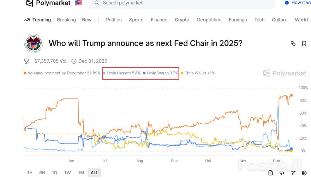 最新的市场数据显示,投资者对美联储未来领导层的预期正经历重大调整。截至本周六,在Kalshi和Polymarket这两个主流预测市场上,沃什被提名的概率分别跃升了17和24个百分点。