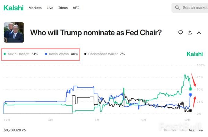 从Kalshi的数据图表可以更直观地看到,沃什与另一位热门人选、白宫国家经济委员会主任凯文·哈塞特(Kevin Hassett)的概率走势呈现明显的此消彼长。沃什的获胜概率一路走高,几乎就要追平哈塞特。尽管哈塞特的支持率有所下滑,但他目前仍以50%的获胜概率暂时领先。