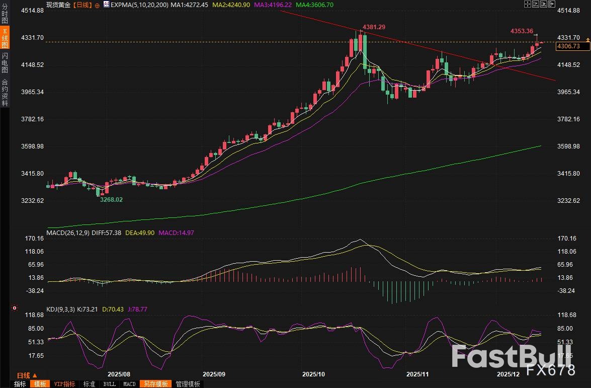上周五(12月12日),在市场对宽松货币政策的预期推动下,黄金价格表现强劲。现货黄金上涨0.48%,收于每盎司4300美元附近,盘中一度触及4353美元/盎司,创下自10月21日以来的新高。美国期金也同步收涨0.4%,结算价为4328.3美元。