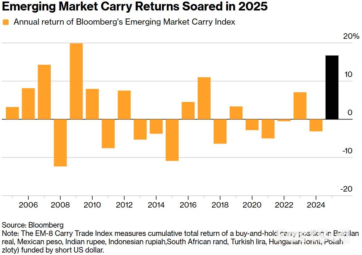 2025年,新兴市场套利交易(Carry Trade)创下了自2009年以来最辉煌的战绩。一项衡量该策略的指标显示,全年回报率高达约17%。简单来说,这种策略就是借入利率低的货币,然后买入利率高的货币,赚取其中的利差。