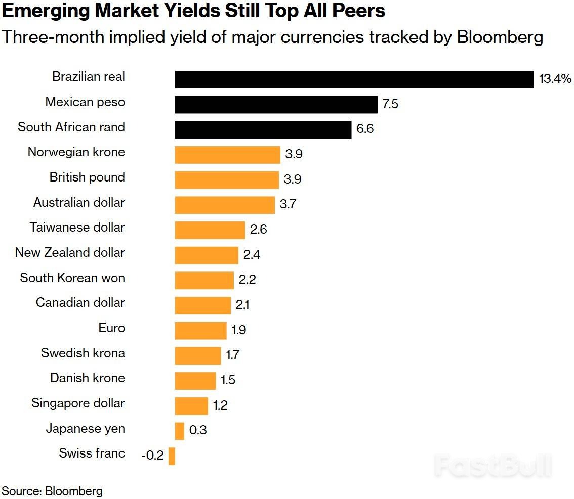 目前,市场对波动的预期较低。摩根大通一项衡量新兴市场货币未来六个月波动性的指标已接近五年来的最低水平。这为套利交易提供了稳定的环境。