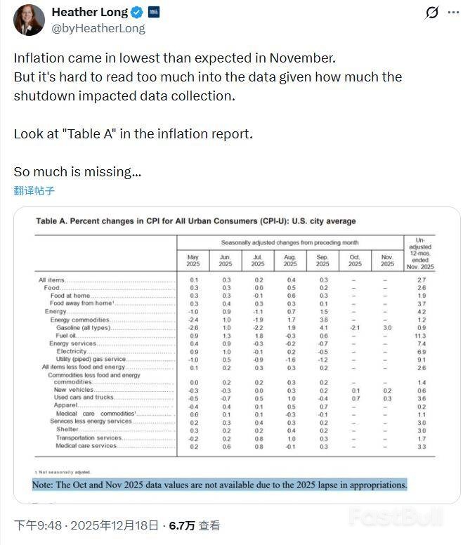 Navy Federal的首席经济学家Heather Long评论道:“考虑到政府关门对数据收集的巨大影响,很难对这些数据做过多解读。” 她展示的截图显示,BLS此次CPI报告的“表A”中存在大量数据空白。