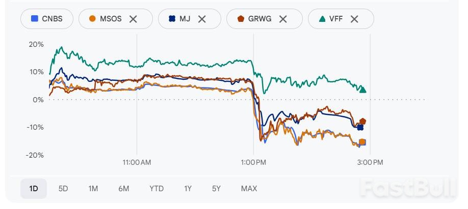 周四,大麻相关股票普遍下挫。追踪大麻产业的ETF中,CNBS大跌近16%,MSOS下跌15.77%,MJ跌幅也超过10%。个股VFF的涨幅则收窄至3.71%。