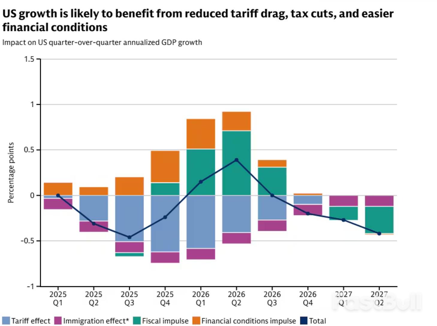 哈祖斯在报告中特别指出,特朗普政府的减税政策预计将在2026年上半年为美国消费者带来约1000亿美元的额外退税,这相当于年度可支配收入的0.4%。这些积极因素,再加上政府停摆后的经济复苏,其提振效应将集中在明年上半年显现,届时美国GDP增长将尤为强劲。