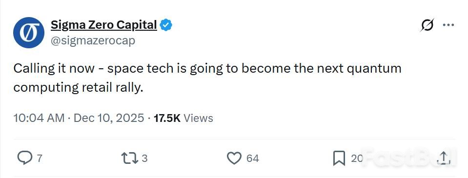 市场的狂热情绪让一些观察人士联想到了此前的科技热潮。投资机构Sigma Zero Capital在社交媒体上评论称:“现在可以断言——太空科技将成为继量子计算之后,下一个散户投资者的狂欢。”