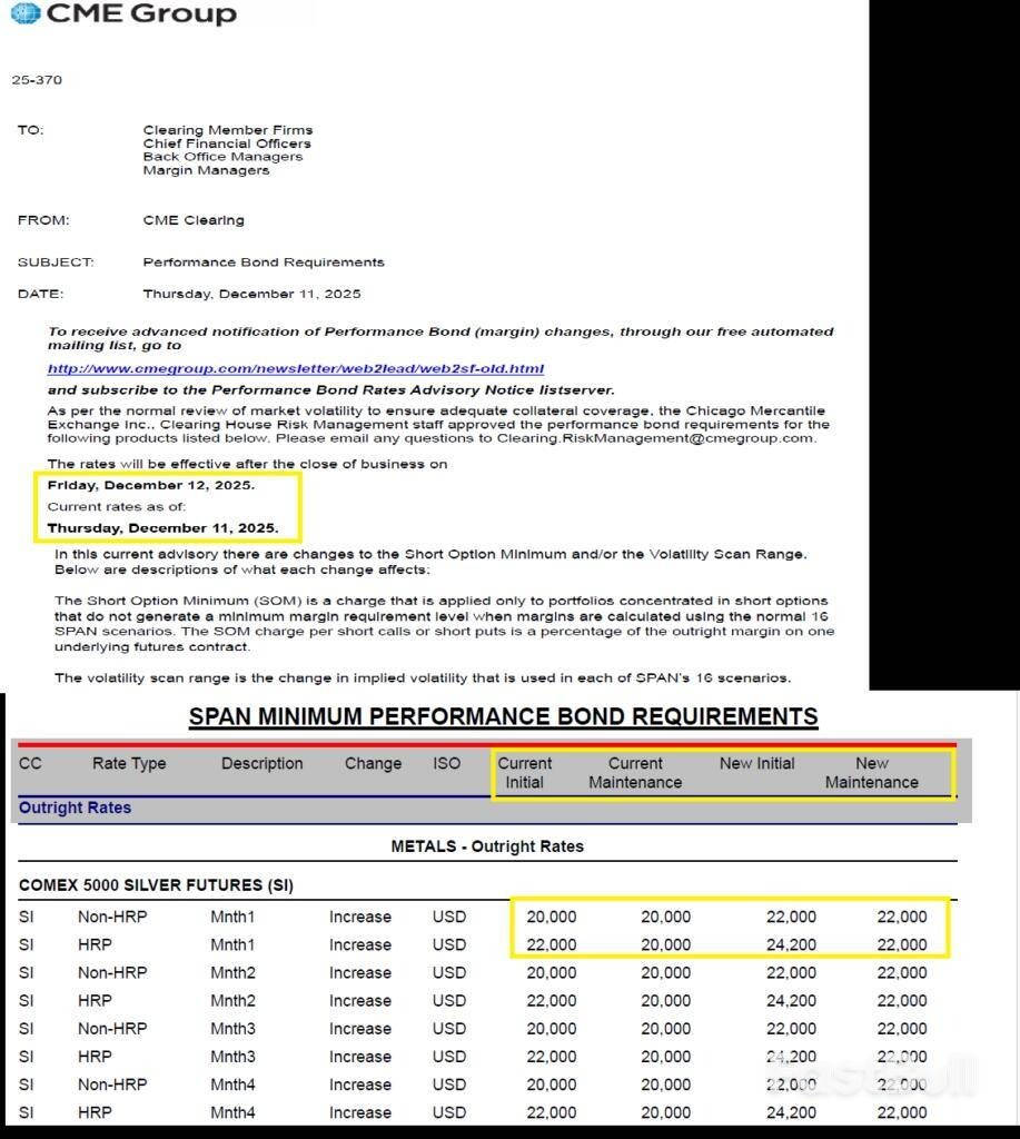 值得警惕的是,CME已于12月12日宣布将白银保证金上调10%。尽管这次调整未能立刻阻止银价上涨,但这与2011年的情况如出一辙——第一次上调保证金往往只是一个开始,真正致命的是接二连三的后续行动。