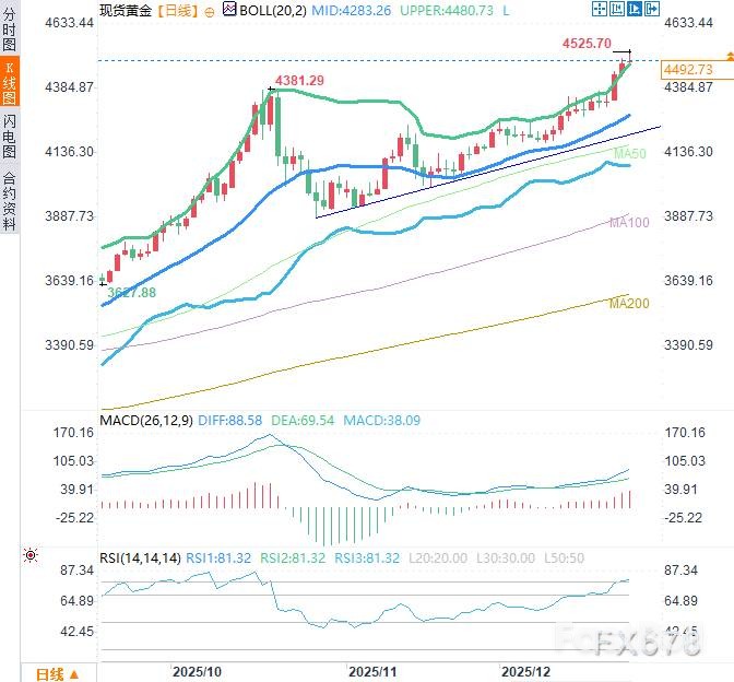 日线图上,金价稳稳守在关键的50日移动平均线(4165.89美元)上方,且自10月末以来的上升趋势线提供了显著支撑。布林带呈现扩张态势,也预示着当前强势趋势有望延续。