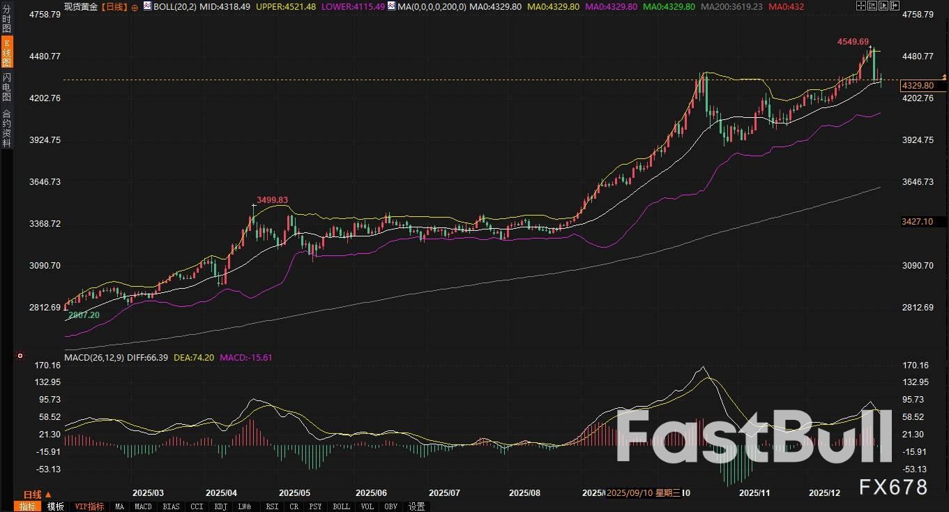 年末资金流动的特殊影响年末时点往往伴随着机构投资者的仓位调整、利润了结和风险管理操作。在黄金经历了创纪录的年度涨幅后,这种季节性效应可能被放大。从技术图形上看,价格在创出新高后未能延续强势,反而在布林带上轨附近遇阻回落,且回落过程中伴随着成交量能的相对萎缩(假期因素),这符合典型的"创新高后技术性回调"特征。