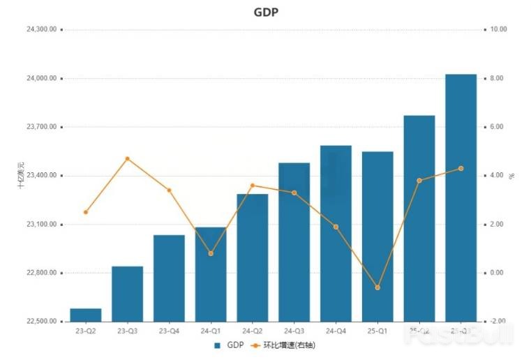 美国第三季度实际GDP按年化季率初值增长4.3%,远超市场预期的3.3%,创下2023年以来最快增速。增长主要由消费者支出、出口和政府开支推动。
