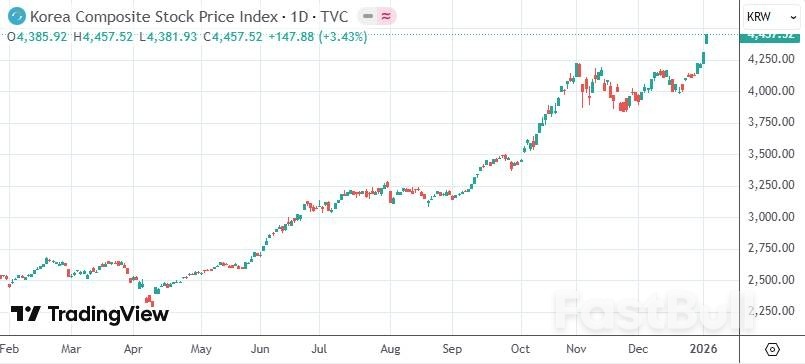 具体行情显示,韩国综合股价指数上涨3.43%报4457.52点,刷新了上周五的收盘纪录,近两个交易日累涨5.77%。去年该指数累涨75.63%,成为全球主要股市中的最牛市场。