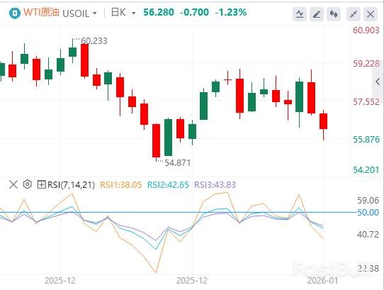 亚洲交易时段,原油价格跌至12月19日以来的新低,WTI原油在55.70-55.65美元区间附近徘徊,市场下行风险似乎正在积聚。截至发稿,WTI原油报价为56.28美元,布伦特原油为60.22美元。