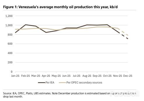 瑞银分析师Henri Patricot指出,虽然禁运名义上仍在,但近期事件降低了委内瑞拉产量持续下滑的风险,甚至可能迎来快速反弹。瑞银预计,一旦限制解除,该国产量有望从当前的约85万桶/日回升至100万桶/日,甚至达到120-130万桶/日。这一潜在增量将成为2026年油市的逆风。
