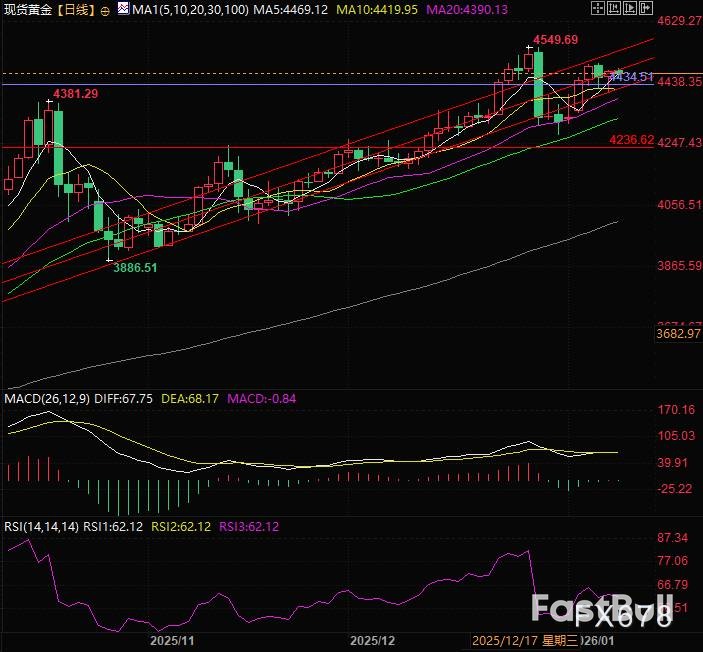 美元指数短线拉升12点后,迅速掉头下跌约26点。现货黄金则在跳水14美元后,强势反弹约30美元,最高触及4491.46美元/盎司。