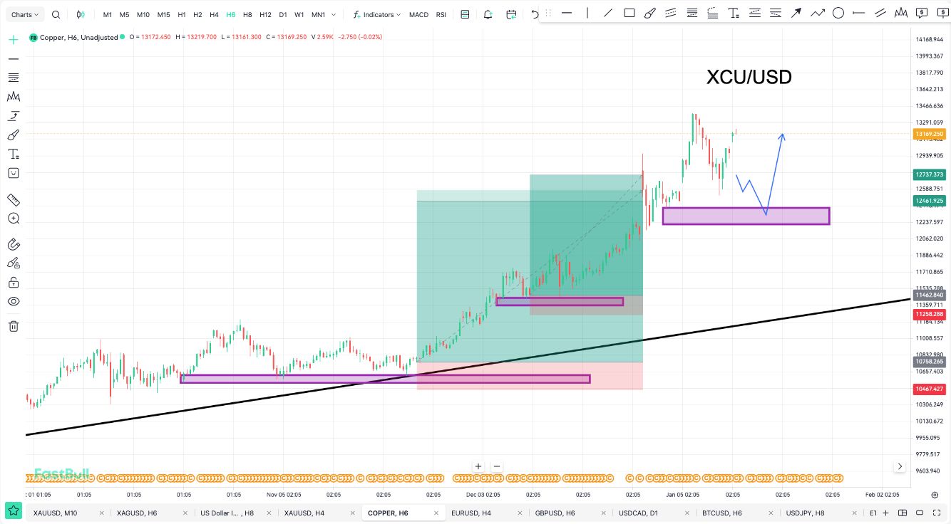 从4小时图来看,白银价格在上升扩散楔形内也形成了看涨结构,目标同样指向90至100美元区间。上升楔形的形成表明,随着价格逼近100美元这一心理关口,市场波动性可能会加剧。