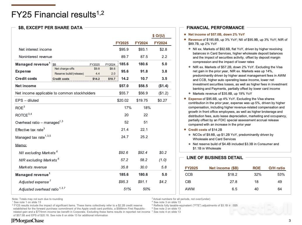 从全年来看,摩根大通在2025年总共取得了1856亿美元的营收,同比增长3%;净利润高达570亿美元,虽较2024年略有下降,但仍相当于平均每天净赚1.56亿美元。