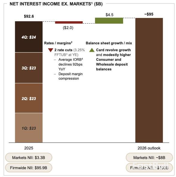 展望2026年,摩根大通给出了相对乐观的指引。在假设美联储年内降息两次的前提下,公司预计全年净利息收入将从去年的959亿美元增长至1030亿美元。主要的增长动力预计将来自信用卡循环余额的增加和存款规模的稳中有升。不过,公司的费用支出预计也将从953亿美元同步上升至1050亿美元。