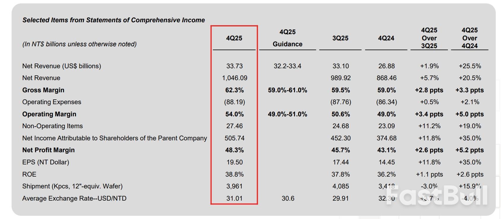财报数据显示,台积电第四季度的关键财务指标表现亮眼: