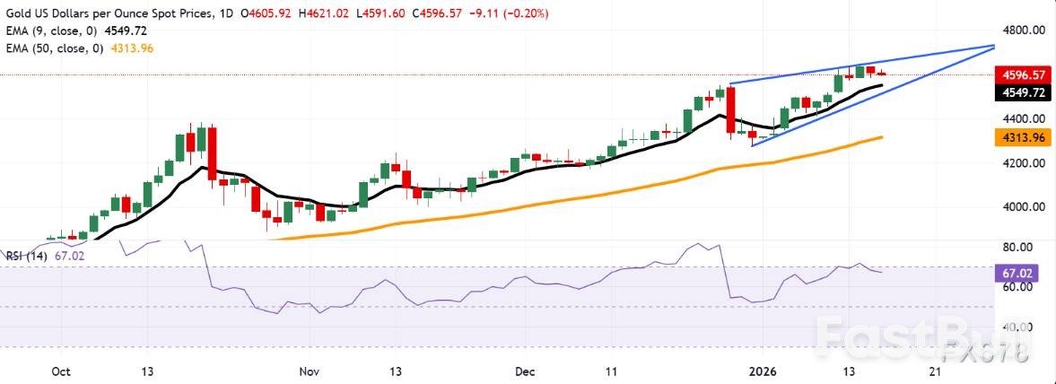然而,下行风险似乎更为突出。初步支撑位于9日指数移动平均线(EMA)的4549美元,更关键的支撑则在楔形下轨的4520美元附近。一旦价格放量跌破该支撑线,可能会引发更深度的回调,下一个目标或将指向50日EMA所在的4313美元。