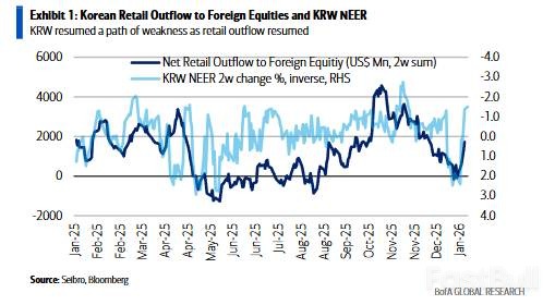 1月15日,美银研究团队发布报告指出,韩元汇率的走向已与韩国散户的投资行为深度绑定。他们对外国股票,尤其是美股的疯狂购买,正主导着韩元汇率的走势。