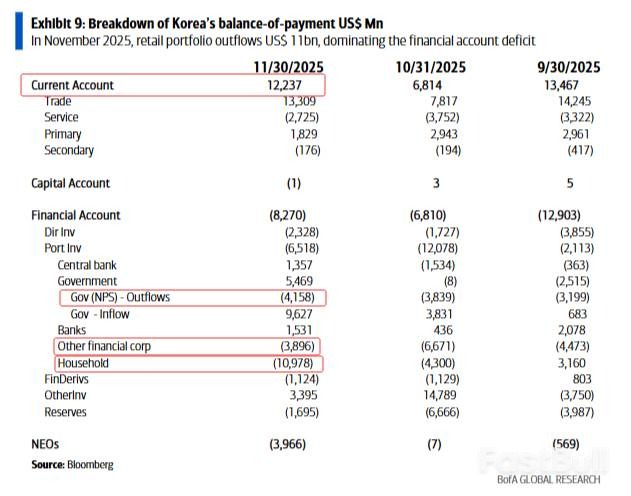 数据显示,同期韩国散户的证券投资外流高达110亿美元,成为当月金融账户赤字的最大单一贡献者,规模远超国民年金(NPS)的42亿美元和资产管理公司的39亿美元。