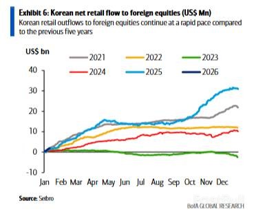数据显示,仅在2026年前10天,韩国散户就净买入了20亿美元的外国股票。这股巨大的资金外流力量,甚至让韩国的贸易顺差和官方表态都显得无力。