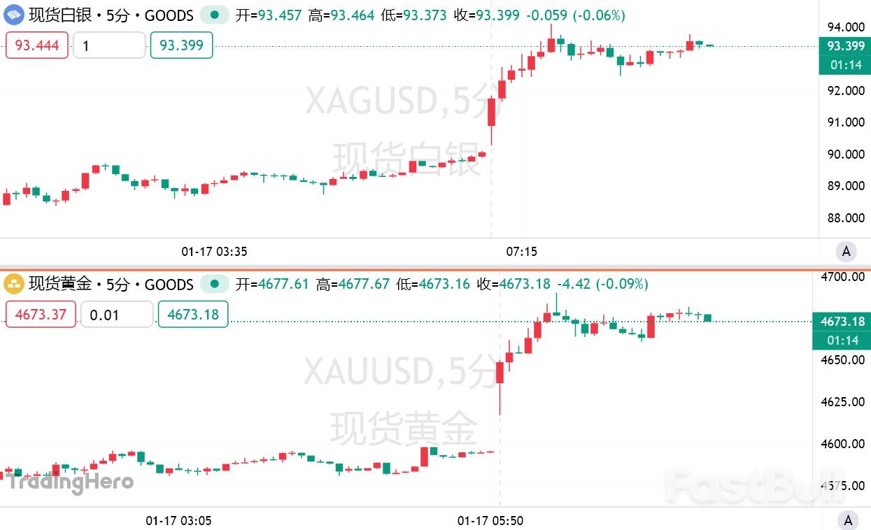 事件起因是这些欧洲国家反对特朗普购买格陵兰岛的计划。受此影响,现货白银盘中一度大涨超过4%,触及每盎司93.69美元的新高。现货黄金涨幅也扩大至2%,报每盎司4690美元,同样创下纪录。