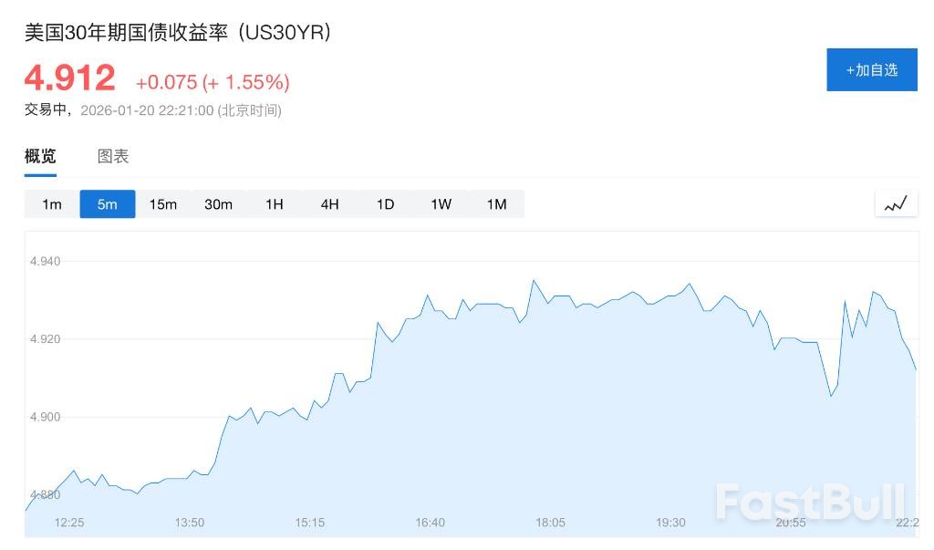 美国国债收益率同步攀升至四个多月高位,长期债券领跌。30年期美债收益率一度上涨10个基点至4.94%,10年期收益率则上升7个基点至4.30%,双双创下去年9月3日以来的最高水平。