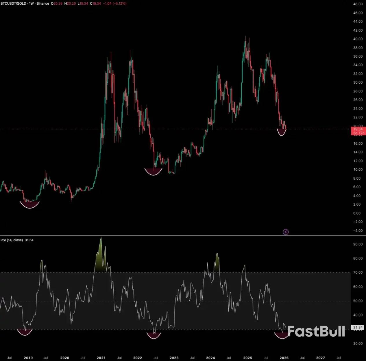 2025年底到现在,我们第四次见证了这一历史性的超卖信号。黄金在2025年暴涨64%,而比特币相对黄金的RSI再次跌入超卖区间。