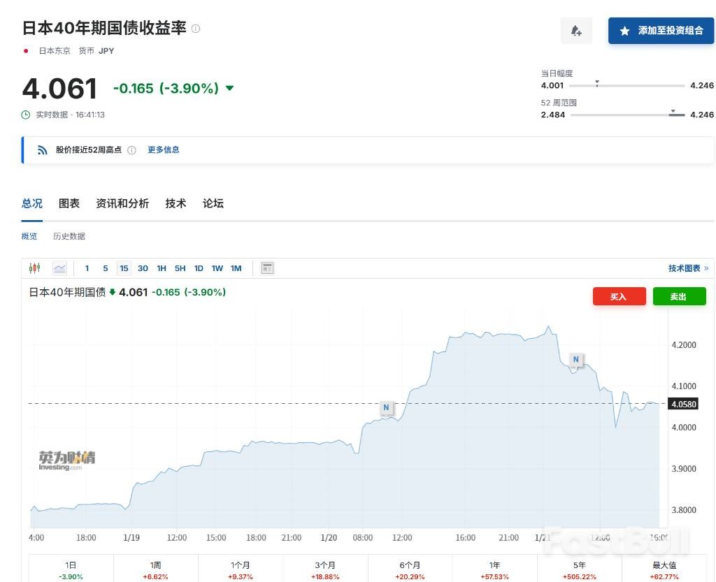 这项被视为打破财政纪律的举措,迅速在市场引发了恐慌。它不仅未能完全赢得选民的信任,反而激怒了债券投资者。作为市场风向标的日本40年期国债收益率,首次突破了4%这一关键心理关口,凸显出投资者对日本财政可持续性的极度担忧。