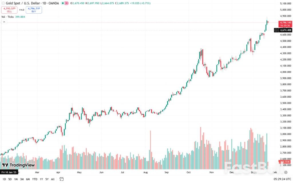 本周三,黄金期货价格收于每盎司4831.80美元的历史新高,涨幅1.5%。仅本月以来,金价累计涨幅就超过500美元,其中周二单日暴涨171.20美元,刷新单日涨幅纪录。