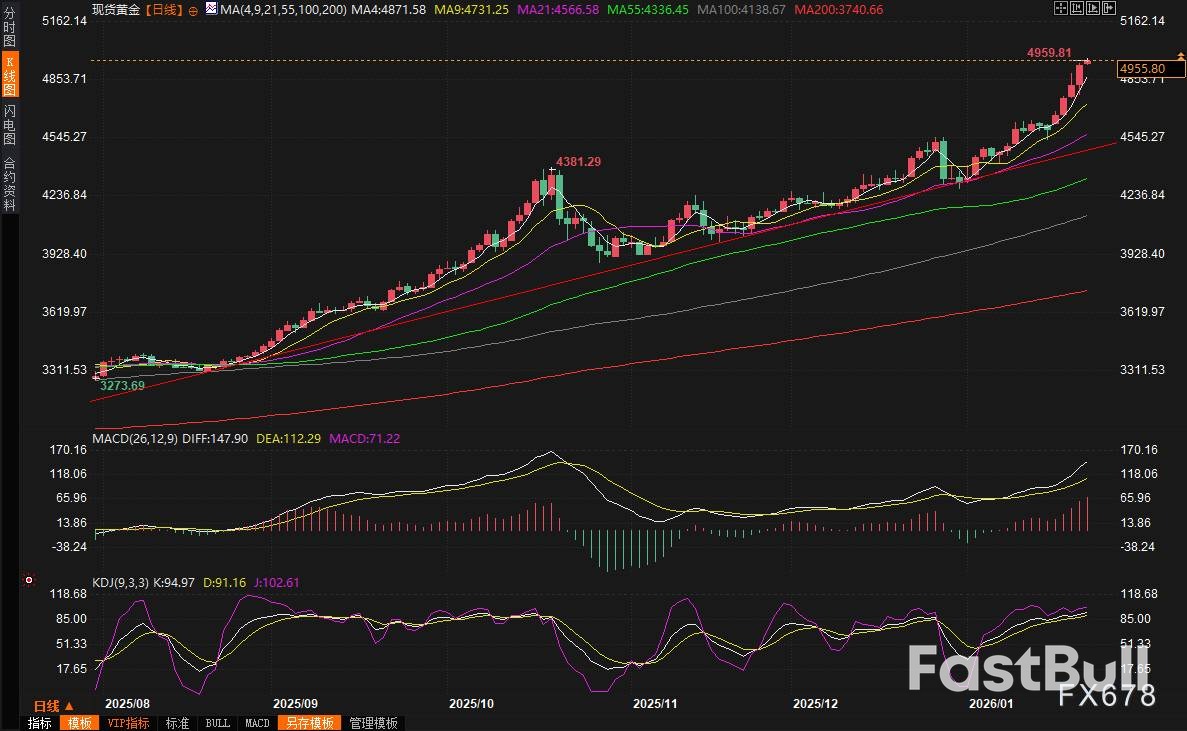 2026年开年,全球黄金市场迎来一场大爆发。现货黄金价格在1月22日(周四)首次历史性地突破4900美元/盎司大关,并一路高歌猛进,于周五(1月23日)亚市早盘创下4960.43美元/盎司的惊人新高。