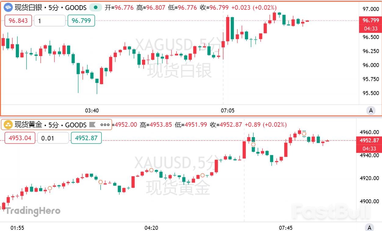 周五亚市盘初,现货黄金站上4950美元/盎司关口,再创历史新高。现货白银报96.79美元/盎司。