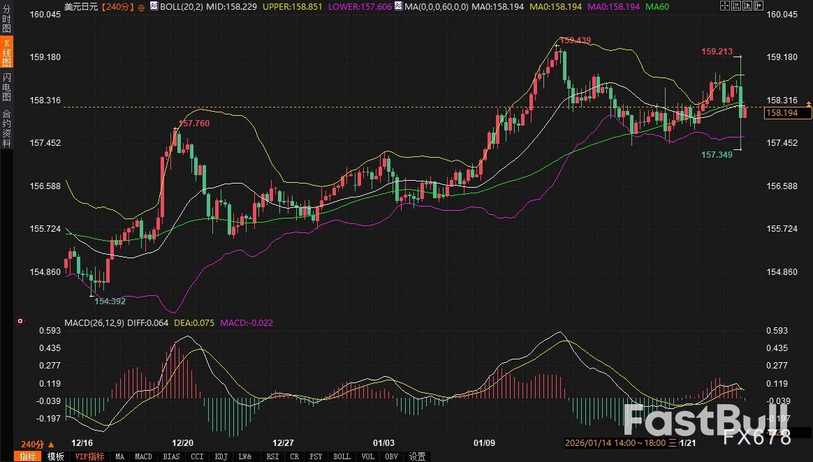 核心支撑区间位于157.60–157.20。 下方的初步支撑在157.60附近,即布林带下轨和近期震荡区间的下沿。更强的支撑则在157.20,这里是前期多个回调低点的汇集区,技术意义重大。一旦跌破该支撑区,可能意味着由日债收益率飙升引发的日元结构性买盘开始占据主导,市场对日本财政风险的定价超过了对美日利差的关注。