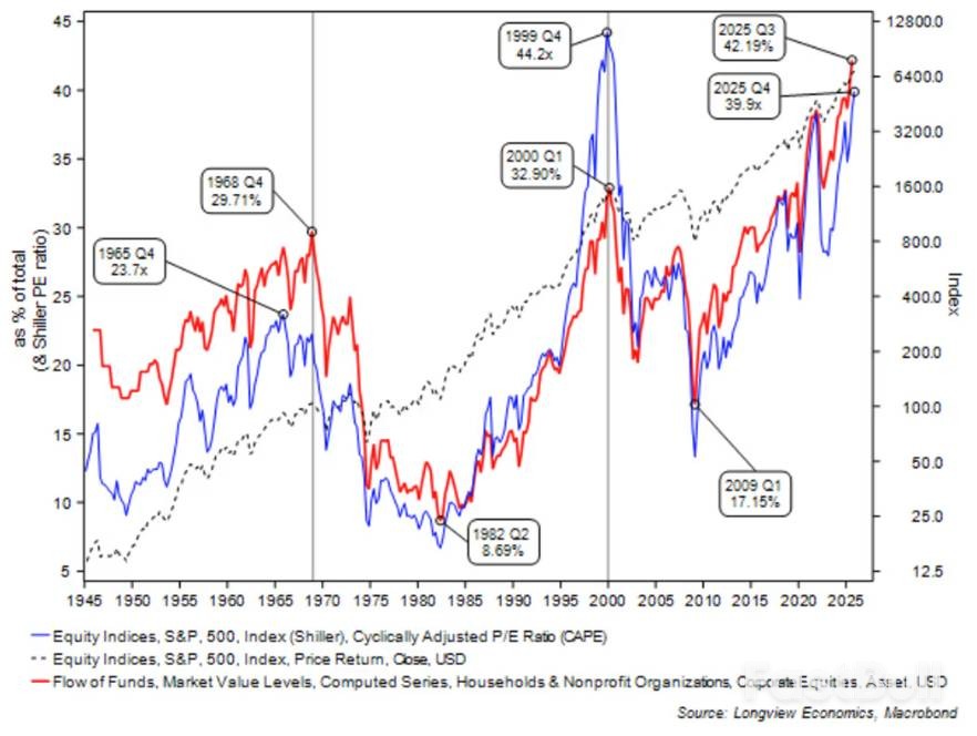 虽然估值无法精确预测短期走势,但对中长期方向至关重要。最新数据显示,衡量美股长期估值的席勒周期调整市盈率(CAPE)已高达39.9倍,这是有记录以来的历史第二高位。