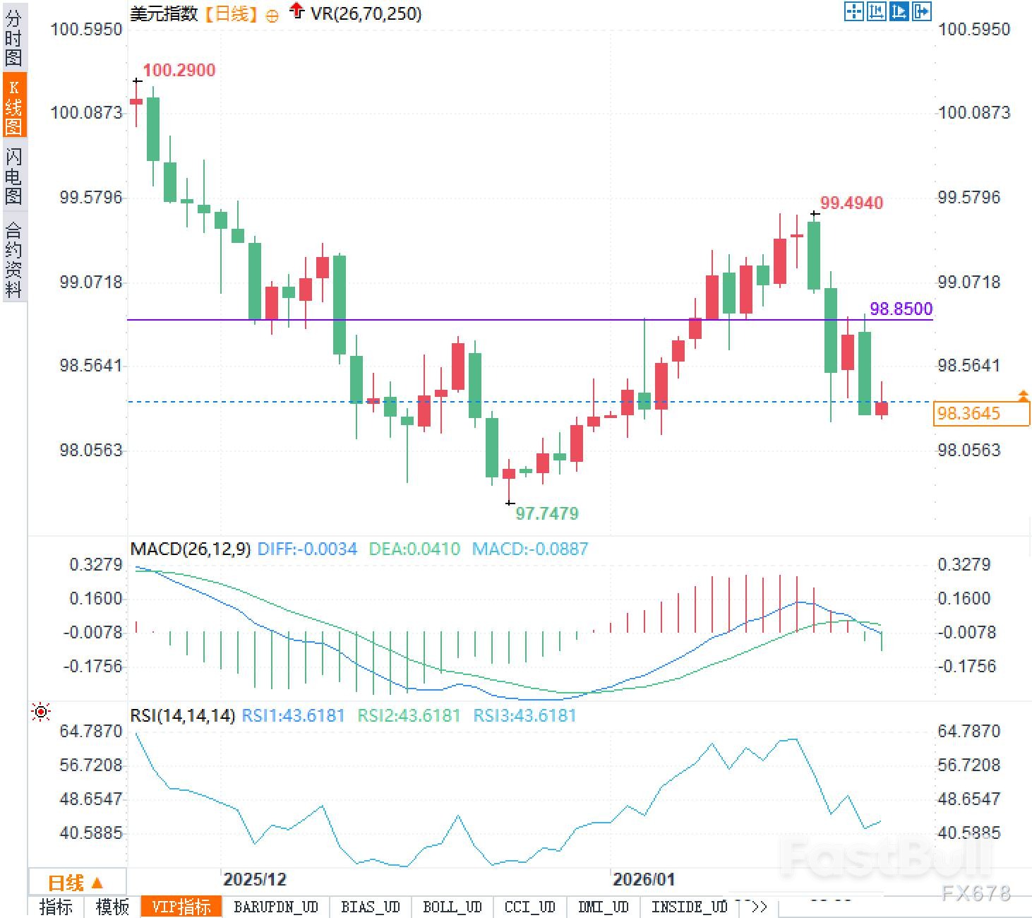 从技术图形来看,美元指数的反弹同样显得十分脆弱。此前指数高点为99.4940,阶段性低点为97.7479。目前价格运行在98.8500下方,这意味着前期上涨的支撑区已经转化为现在的阻力位。