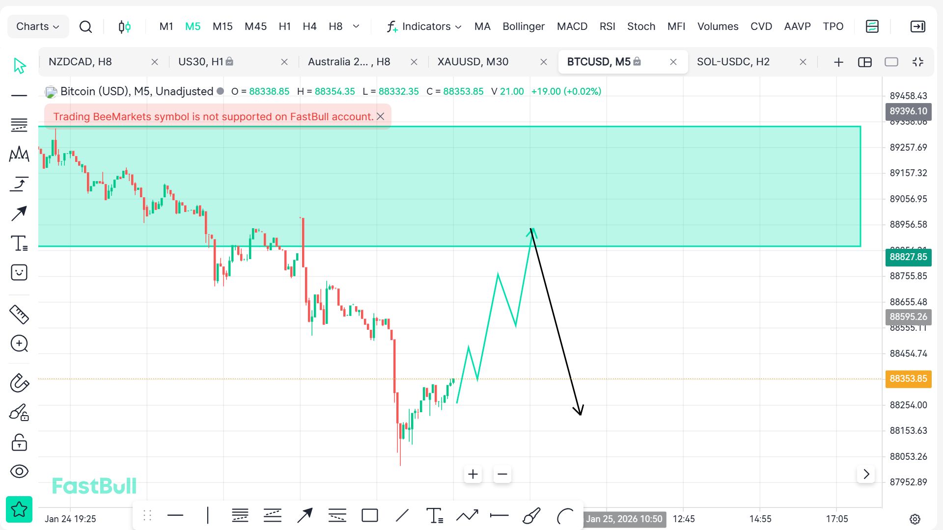 • 关键支撑: 4,888.94美元,为波浪尺0.382扩展位与布林带中轨的共振区域,是当前多头趋势的关键防线。