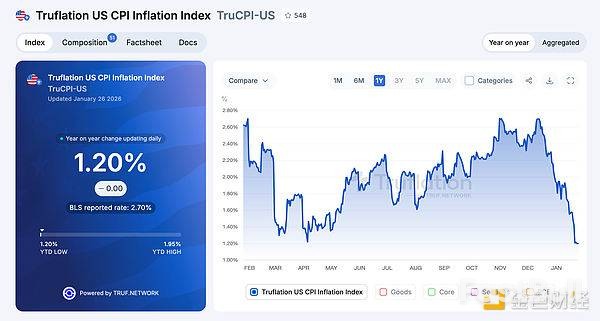 从近期峰值来看,Truflation的数据显示通胀在短短三个月内就下降了151个基点。它的数据来源于超过1400万个每日价格点,比官方指标更快地捕捉到了价格转向通缩的趋势。这意味着成本压力正在发生根本性调整,而官方数据可能要几周后才能证实这一点。