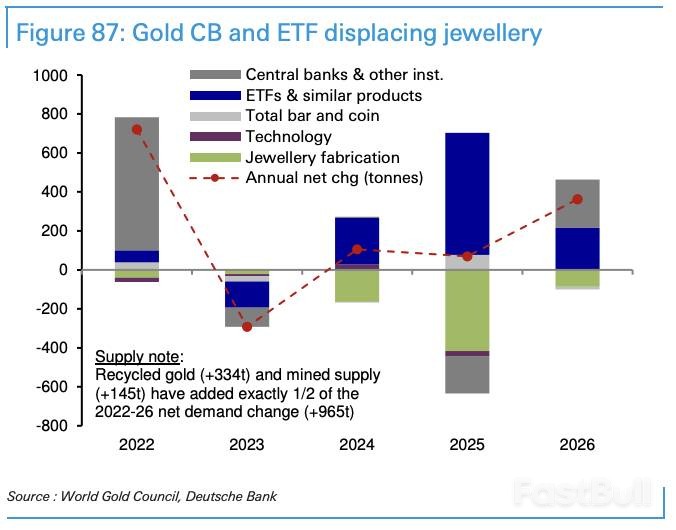 黄金市场正面临显著的供需失衡。根据德银报告,在2022至2026年间,仅央行和ETF带来的黄金需求净增长就高达965吨,而同期回收黄金(334吨)和新增矿产供应(145吨)加起来也只能满足其中一半。