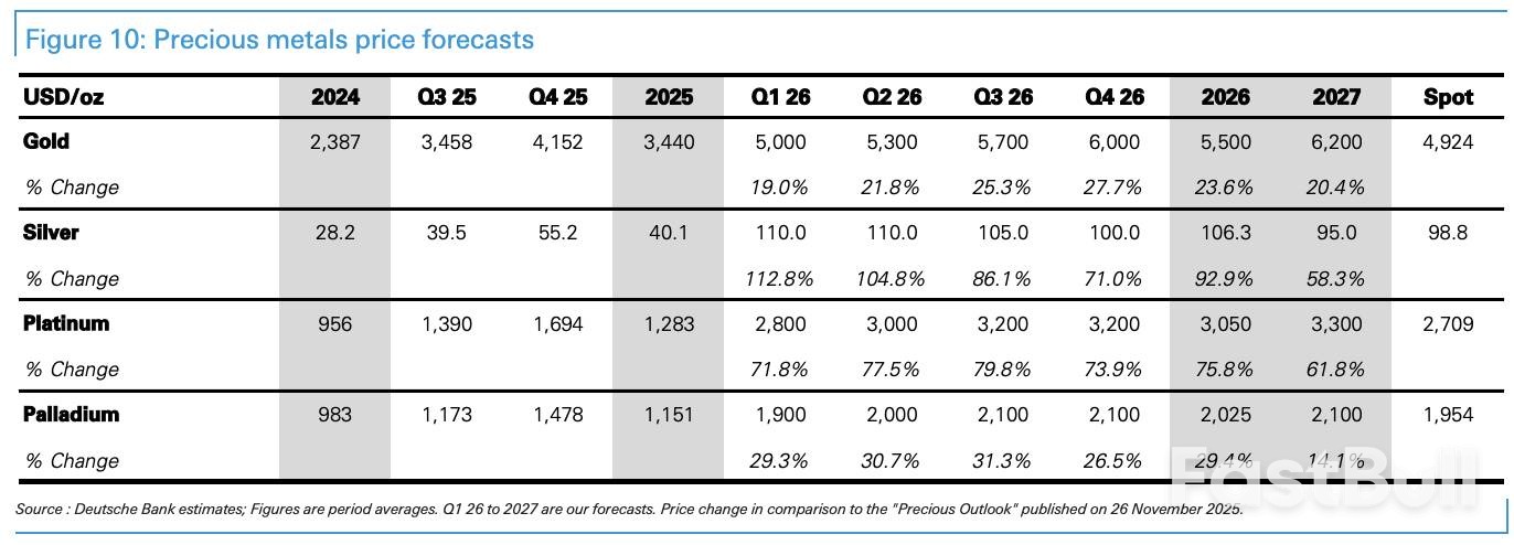 国际货币基金组织(IMF)预测,到2029年,全球政府债务占GDP的比例可能升至100%,在悲观情景下甚至可能达到123%。德银认为,这一宏观前景,叠加美元在2026年底前将持续贬值的预期,构成了配置贵金属等实物资产的核心理由。