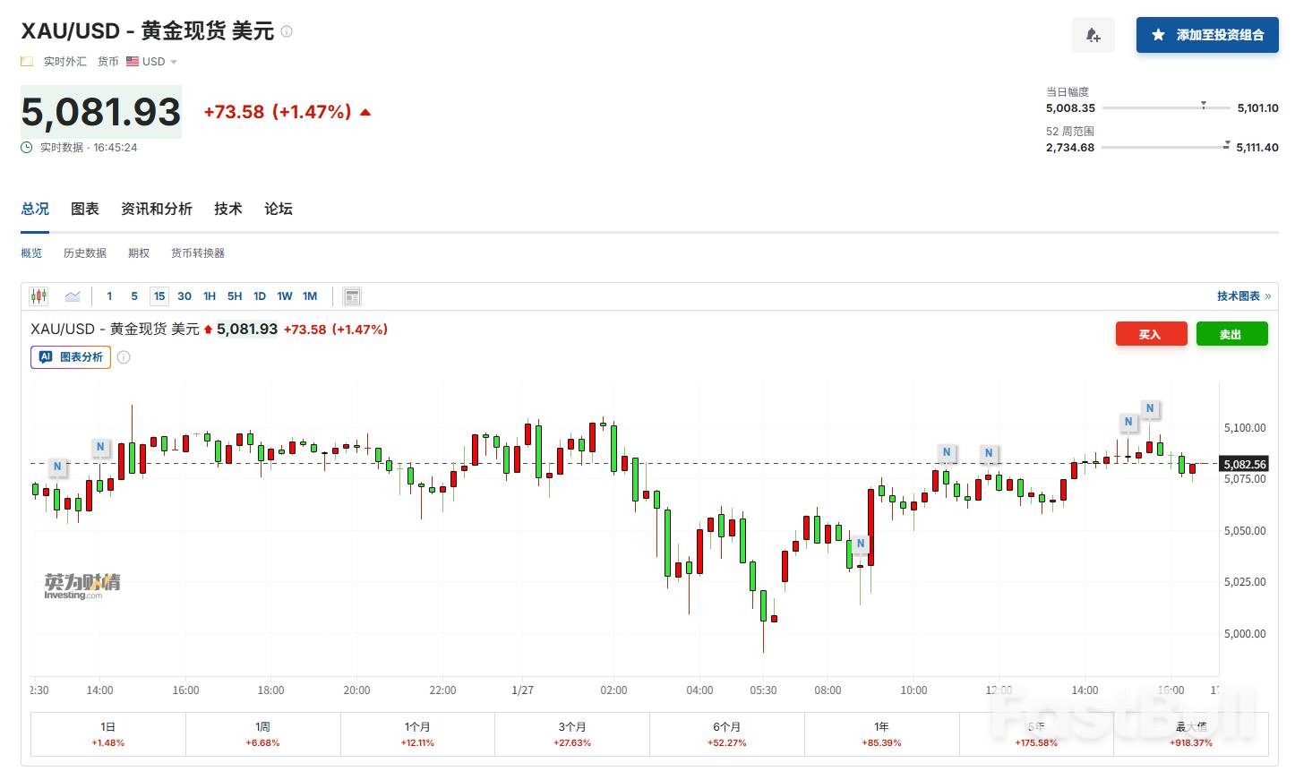 黄金市场的涨势比许多人预想的更为迅猛。周一,现货黄金价格一举冲破5000美元整数关口,盘中一度上涨2.5%,触及5110美元/盎司的高位。截至发稿时,金价有所回落,仍在5080美元/盎司附近交投。