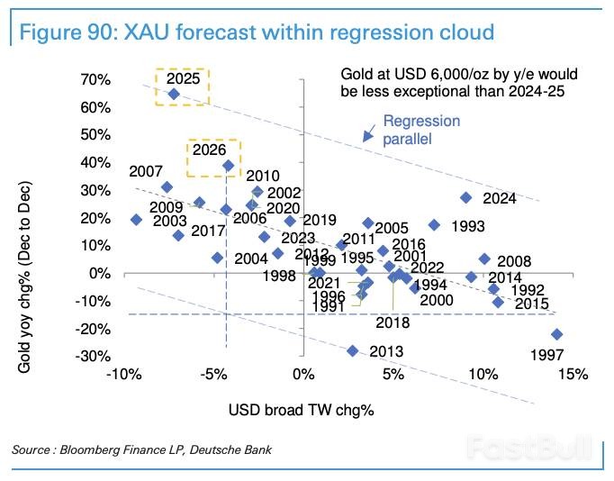 基于回归模型,德银预测在一般情景下,今年黄金价格将涨至6000美元/盎司。报告同时指出,黄金市场可能已形成拥挤的多头仓位,短期或出现10%左右的回调,但任何此类回调都应被视为加仓的机会。