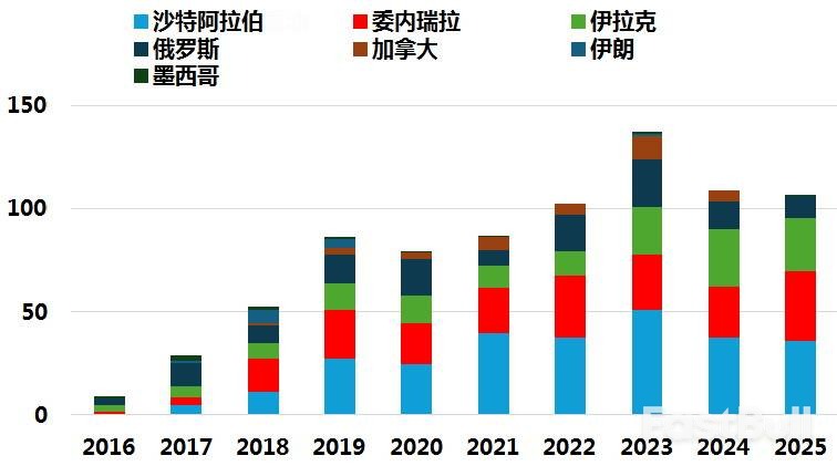 据第三方机构测算,到2026年底,委内瑞拉原油产量有望恢复至100万桶/日以上,到2028年有望接近200万桶/日。然而,若想将产量提升至300万桶/日的水平,根据Rystad的统计,需要高达1830亿美元的投资和长达15年的建设周期。