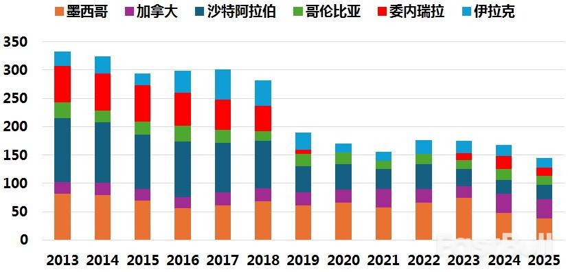 在此之前,美国主要通过海运从墨西哥(2025年日均38万桶)、加拿大(日均33万桶)等国进口重质原油。委内瑞拉原油的大量涌入,将直接替代部分来自加拿大和墨西哥的份额,导致后两者的原油价格贴水面临扩大的压力。
