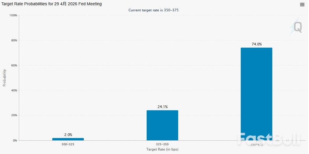 根据芝商所(CME)的“美联储观察工具”显示,市场目前预测美联储在4月会议(即鲍威尔任内最后一次会议)上降息的概率仅有约26%,而维持利率不变的概率则高达74%。