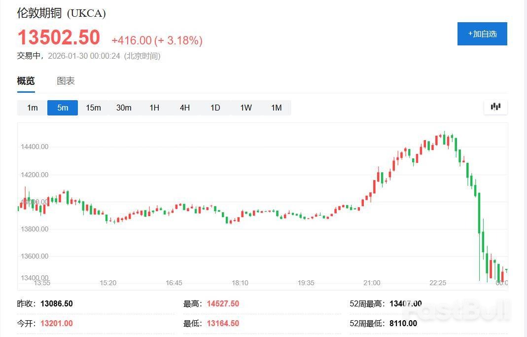 周四的伦铜市场更是上演了历史级的剧烈波动。伦敦时间凌晨2点30分起,伦铜在不到一小时内上涨超过5%,并在美股盘初冲高至1.452万美元上方。然而,随着美元走强和市场风险偏好逆转,伦铜迅速回吐大部分涨幅。