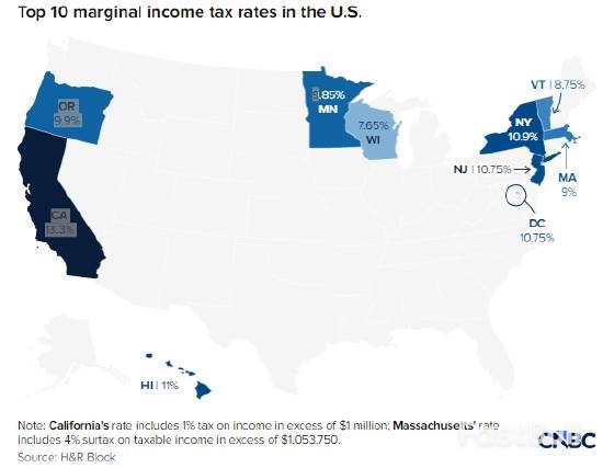 • 纽约州:市长施压州长,提议对百万富翁加征2%的个人所得税,这将使纽约市居民的市、州、联邦最高综合税率达到惊人的53.8%。