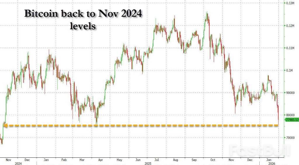 比特币的价格从周五的83817美元一路下跌,到周六晚间已跌至78092美元,跌幅达7%。价格水平已回落至25年4月后的位置,延续了数周以来的宏观层面失望情绪。